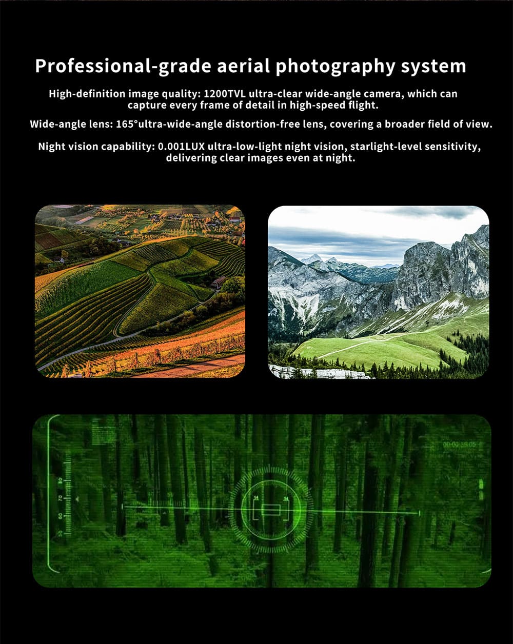 High-Definition Imaging: 1200TVL wide-angle camera (165° distortion-free, 001LUX night vision)