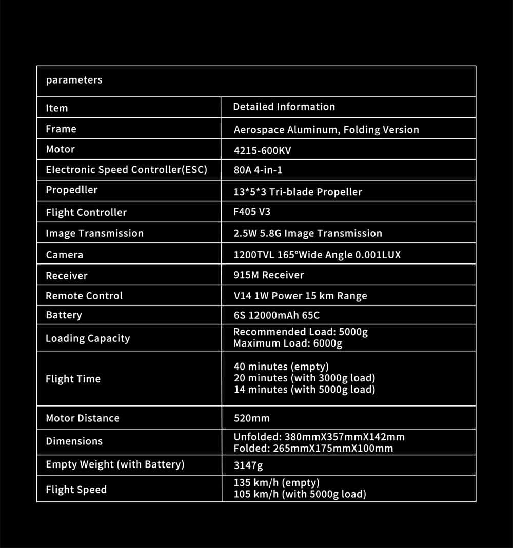 Load Capacity | Recommended payload: 5000 grams, maximum payload: 6000 grams |