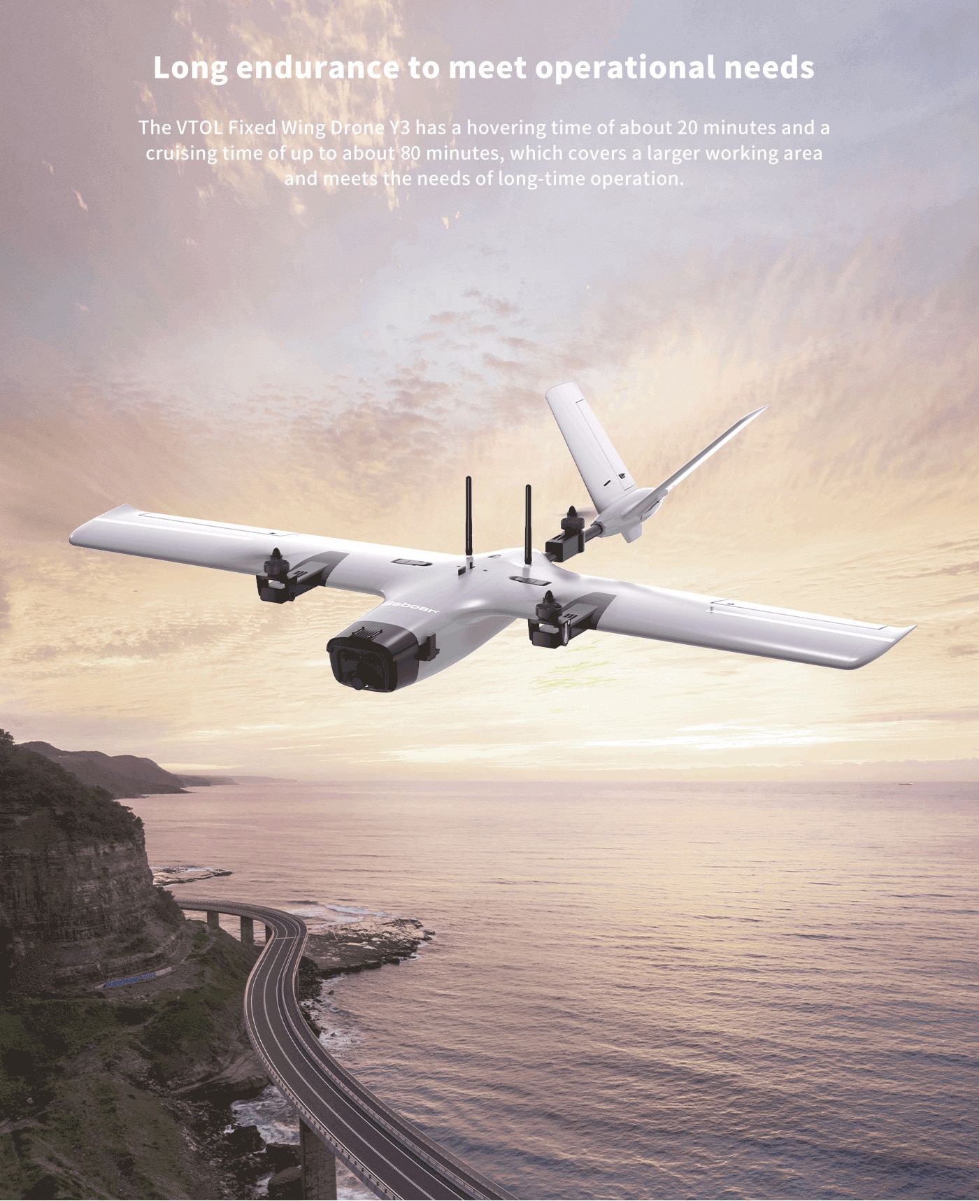 • Hovering time: 20 minutes | Cruise time: 60 minutes (speed 43 km/h)
